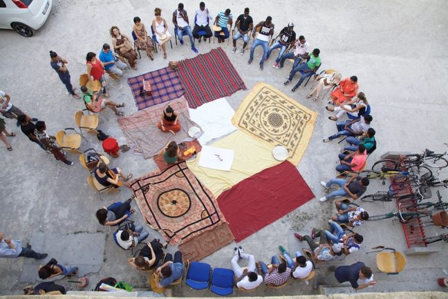 Gli eventi targati Arte Migrante si articolano in tre fasi: ci si riunisce tutti a formare un grande cerchio; si mangia insieme: si cerca di portare ognuno qualcosa da mangiare e offrire all’altro; e infine, iniziano le condivisioni.