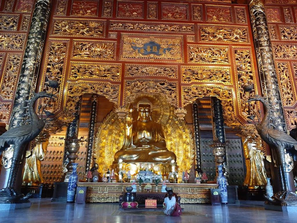 Sta ancora immaginandosi gli interni di quel palazzo maestoso, che si imbatte in un via vai di persone, dal marciapiede ad un cortile interno. Cosa andranno mai facendo? Si avvicina cauta, quasi sospettosa, varca la soglia del cancello che dà sulla strada e si ritrova a camminare sul perimetro di lanterne e fiori che circonda un edificio quadrangolare. Dai colori chiari. Oltre alla lanterne e a bandierine penzolanti, qualche ornamento dorato. Sale gli scalini che conducono alla porta principale e, approssimato l’ingresso, si ferma esitante davanti a una stuoia di scarpe, non allineate, bensì buttate a casaccio, tante cuccette per piedi stravaccate sul tappeto rosso sotto il terrazzo porticato che cinge l’edificio. Butta un occhio dentro: un silenzio carico di pensieri. A destra un altarino sul quale sono esposte, tutte ben allineate come alla recita di fine anno, le offerte più disparate (che siano offerte lo si intuisce dalla devozione con cui la gente vi si prostra): frutta, fiori, dolciumi, e i più disparati tipi di merendine (tante confezioni di Kinder Delice che assolvono in silenzio alla loro sacra funzione decorativa).