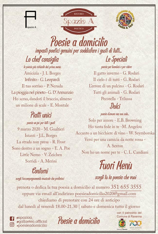 Come funziona? Questa esperienza, proprio come quella del cibo d’asporto, parte prima di tutto da un menù di impasti poetici genuini per soddisfare i gusti di tutti, così leggiamo nel vero e proprio menù di poesie che si trova sulla pagina Facebook dell’associazione. Una volta che l’ordine viene effettuato, gli artisti arrivano sotto casa del destinatario, vestiti con la tipica divisa da rider e con un cartone della pizza in mano. Ecco che aprendolo, però, rivelano il contenuto dell’ordine: una poesia che recitano a distanza.