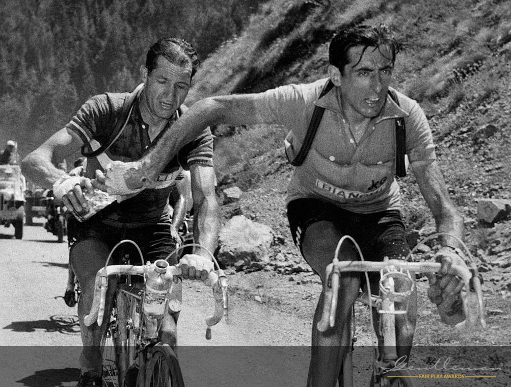 La prima vittoria in un grande Giro arrivò un po’ a sorpresa, nel 1940, proprio contro Bartali, all’epoca suo compagno di squadra e, da quel momento in poi, la sfida non si fermò mai, sempre, però, all’insegna del più totale rispetto fra i campioni, come dimostra la celebre fotografia scattata durante il Tour del 1952, poi vinto da Coppi, dove i due si passano una borraccia.
