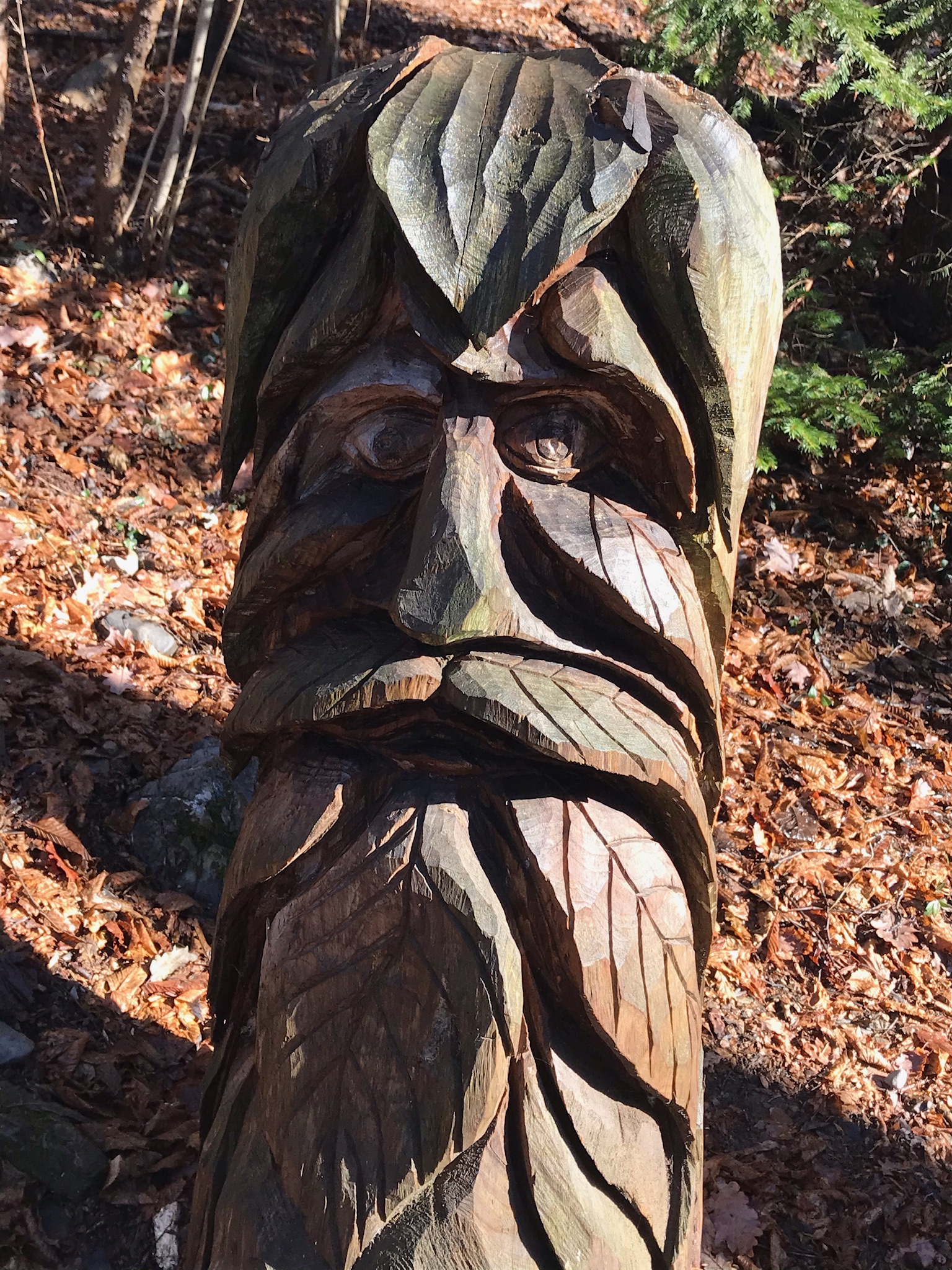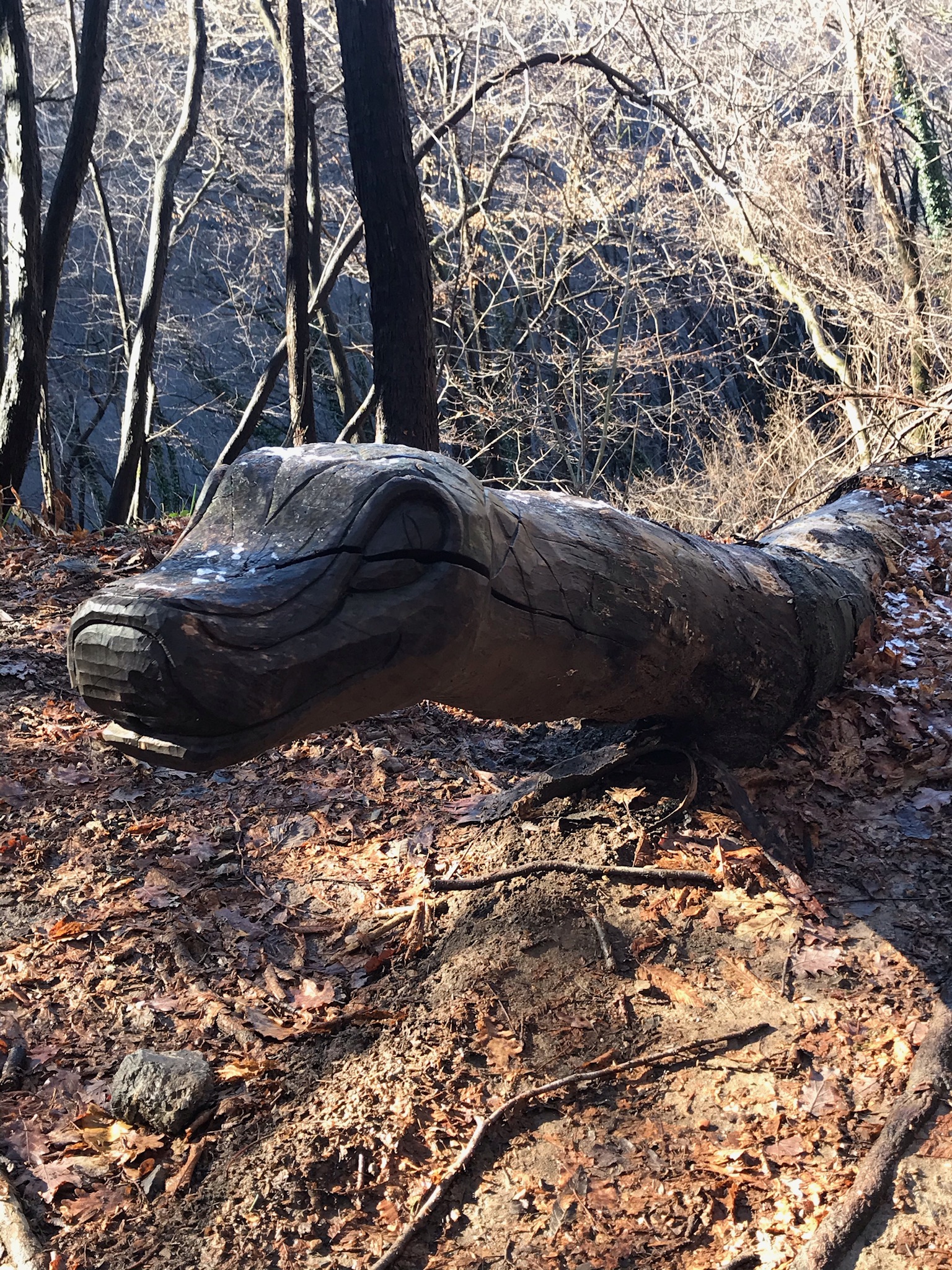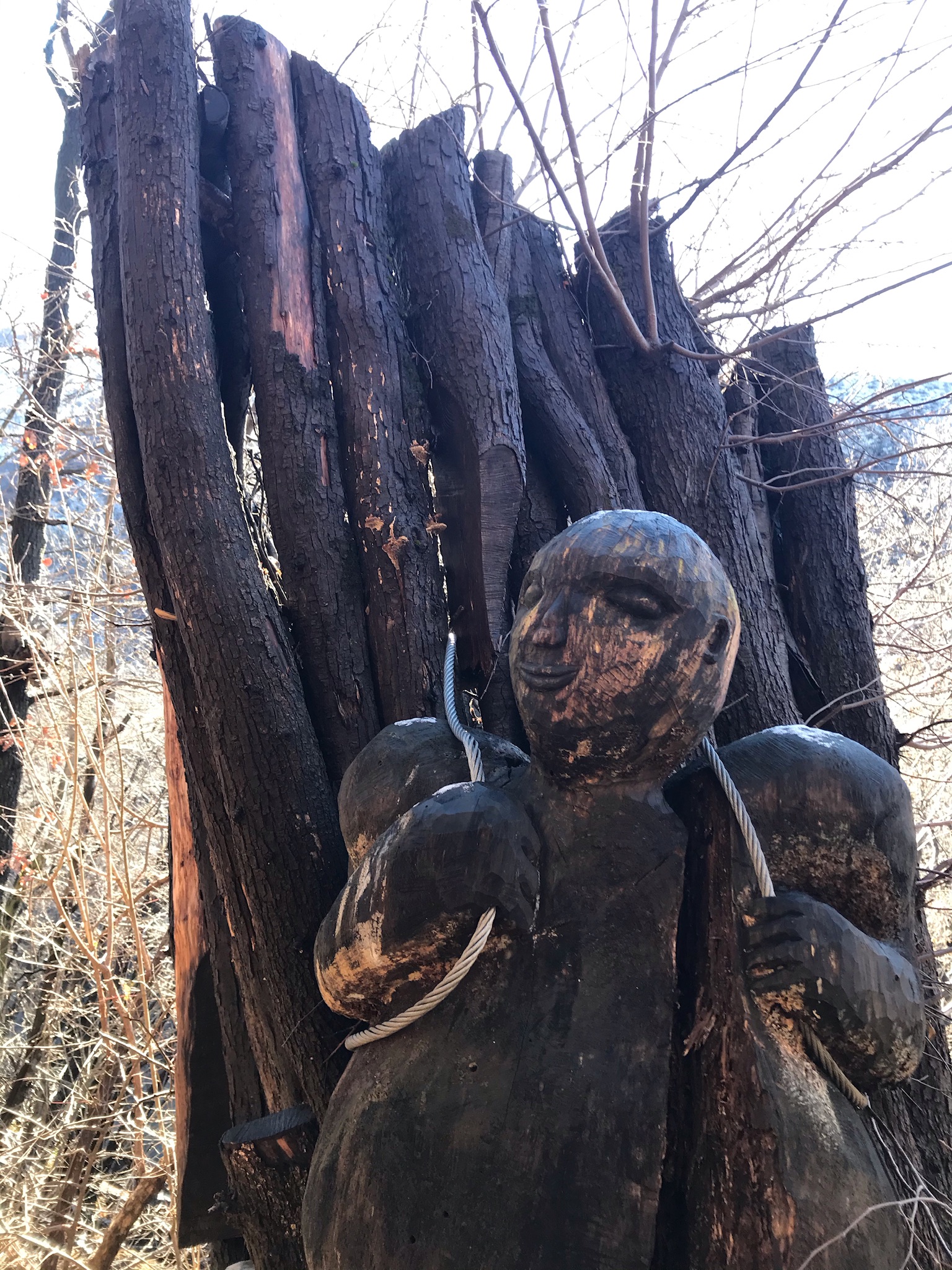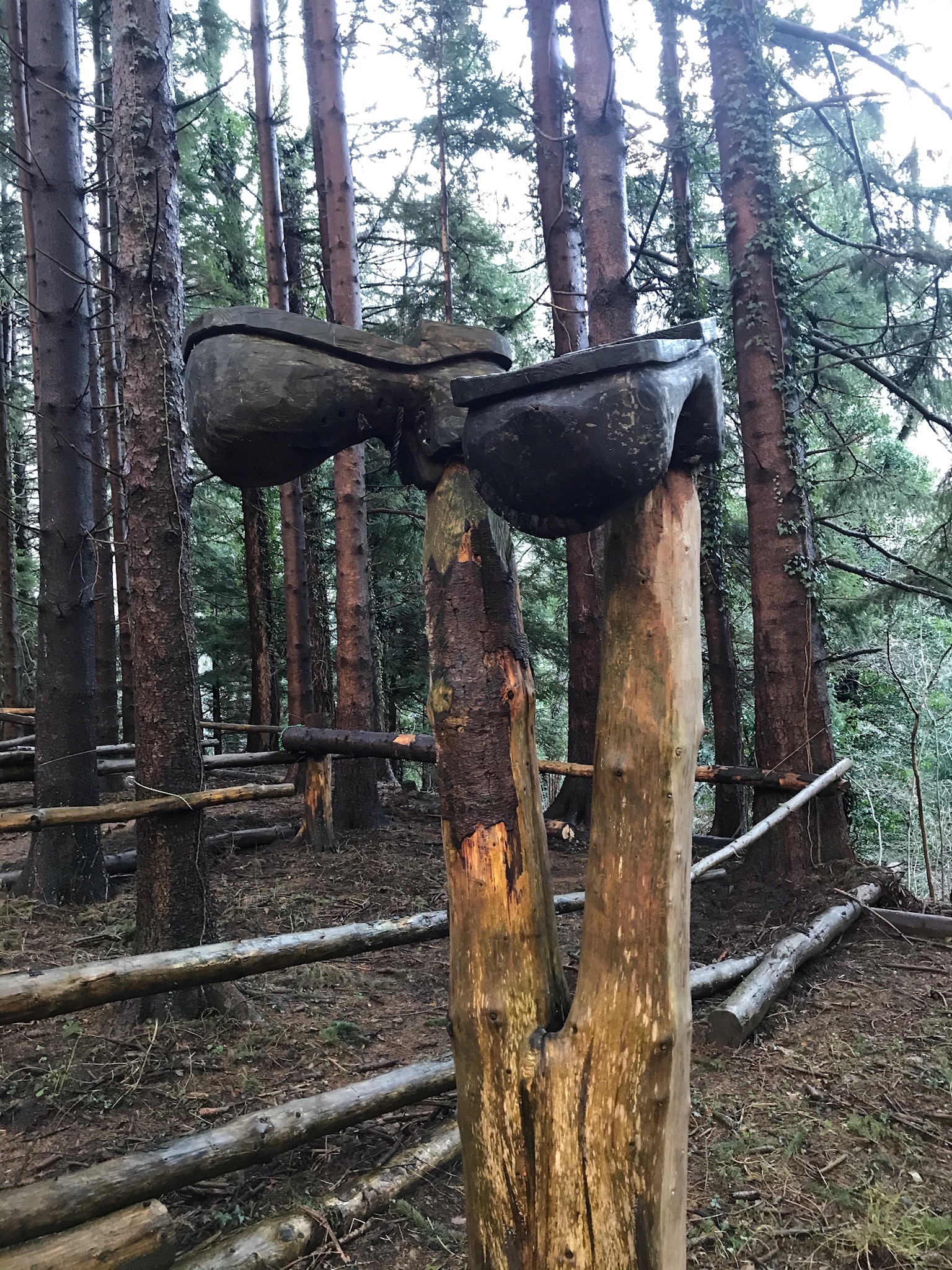 È stato proprio mentre ero preso da questi pensieri che ho intravisto la prima statua. Una proboscide d’elefante che spunta da un tronco a terra e piomba nel sentiero. M’avvicino per studiarne le venature, i colpi lasciati dallo scalpello, provo ad allontanarmi e noto che da una certa distanza diventa estremamente difficile riconoscere l’opera immersa nel verde della Natura, come se non volesse essere vista da lontano. Bisogna infatti restare attenti, allontanare i pensieri di tutti giorni che albergano gratuitamente nelle nostre teste e dare importanza a ogni singolo passo, ogni singolo albero o tronco. Per vedere davvero ciò che il Sentiero ha in serbo per noi dobbiamo vivere nel momento e goderci il viaggio.