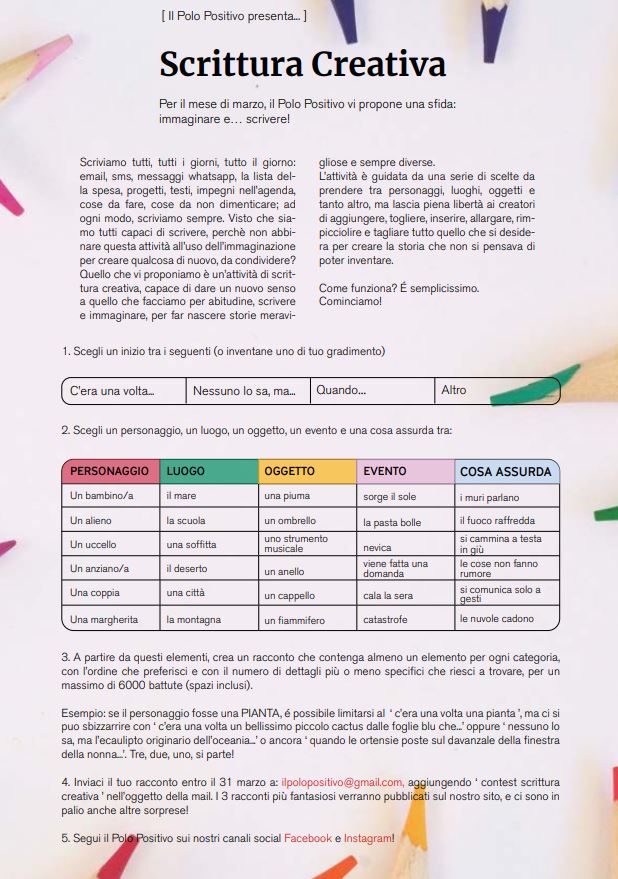 Per il mese di marzo il Polo Positivo vi propone una fantastica iniziativa di Scrittura Creativa, un tentativo di promuovere la scrittura e l’immaginazione tra grandi e piccini. Tutti possono partecipare!