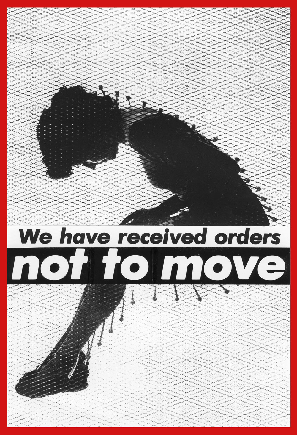 In We have received orders not to move, rappresenta la donna subordinata, da parete e messa su sfondo per rimarcare il suo ruolo marginale, con lo scopo di smuovere le coscienze e generare movimento. Più esplicito sul piano politico, è il famoso slogan Your body is a battleground (‘il tuo corpo è un campo di battaglia’ N.d.T.), realizzato per la marcia delle donne a Washington D.C. nel 1989 a favore dell’aborto e del diritto delle donne di gestire il proprio corpo.