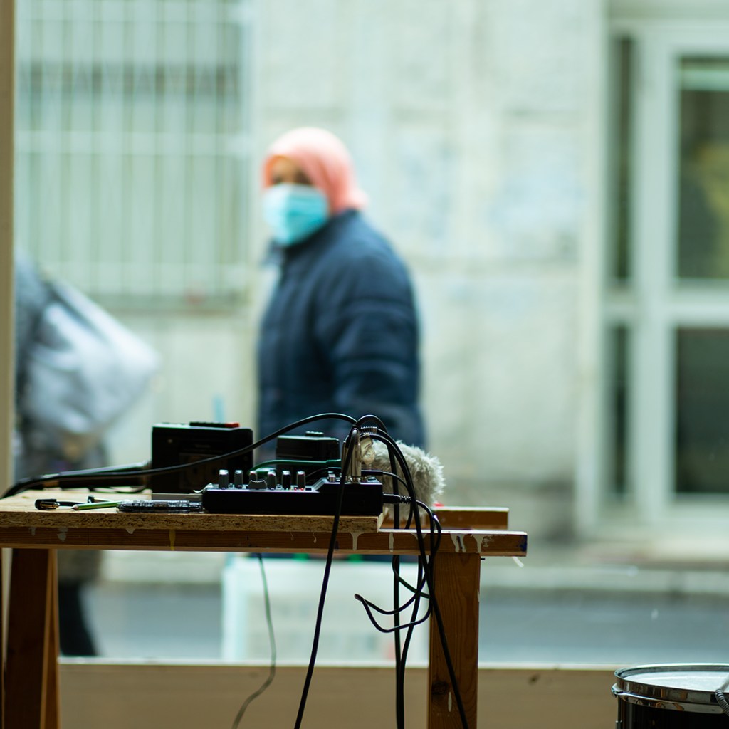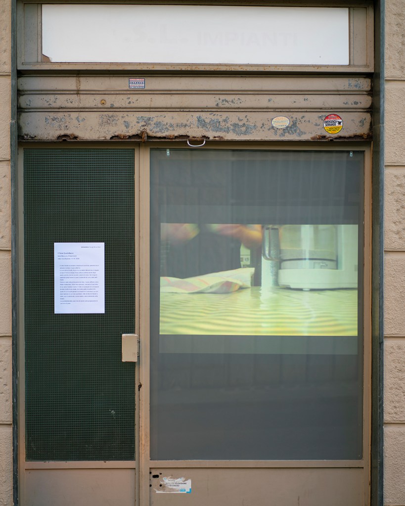 Lo spazio si affaccia sulla strada tramite una grande vetrina che, in questo periodo di pandemia, costituisce un punto di contatto con la realtà circostante.