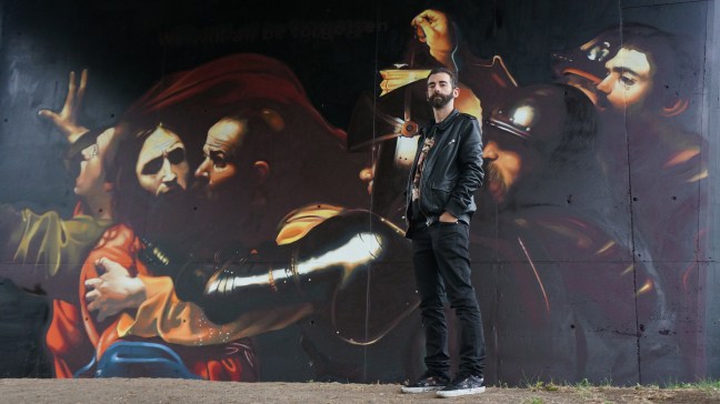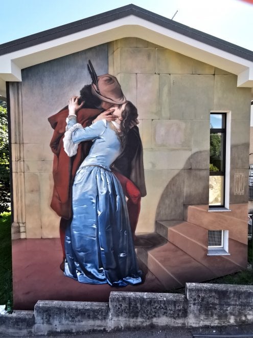 Ma cosa fa concretamente Ravo? In poche parole: porta le opere d’arte antica fuori dai musei, letteralmente. L’urban artist riproduce su muro i quadri dell’arte classica, dal Rinascimento fino al Romanticismo, utilizzando solamente le bombolette e riuscendo a ricreare tutti i dettagli delle opere originali. Così, opere estremamente famose ci appaiono all’improvviso davanti agli occhi, ingigantite, svoltando l’angolo della strada, come nel caso del Fanciullo con canestra di frutta di Caravaggio ad Angera (VA) o del Il bacio di Hayez a Comabbio (VA).