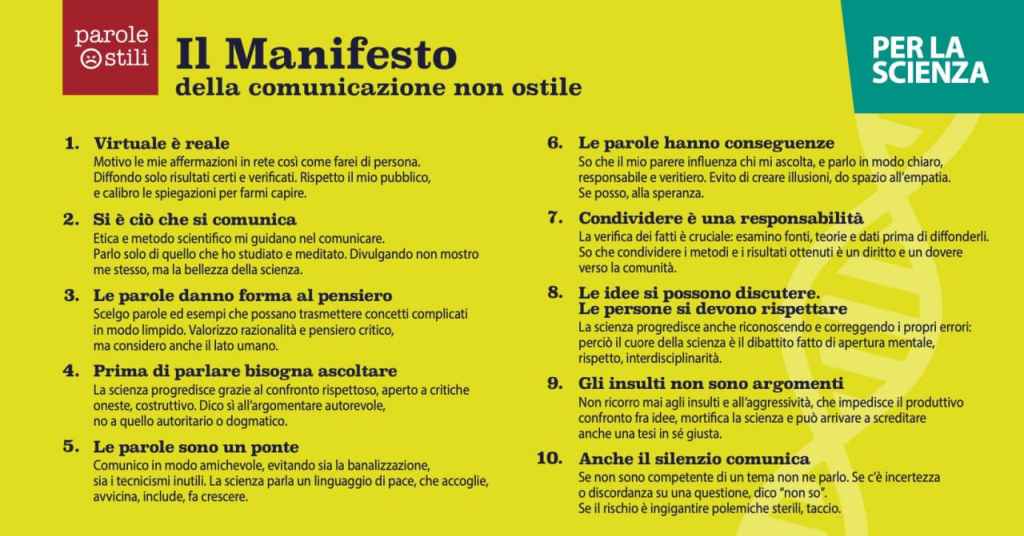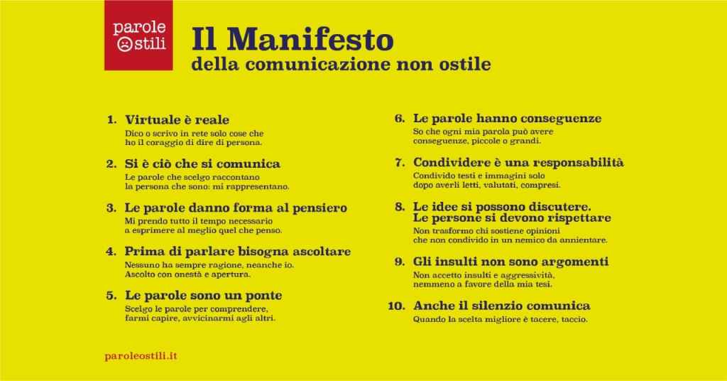 Per questo nel 2016 nasce l’associazione no-profit Parole O_stili, che combatte l’odio delle parole. Il Manifesto è composto da dieci princìpi ed è sottoscritto da trecento utenti, influencer e comunicatori per incentivare un uso positivo, più civile e pacifico di Internet.