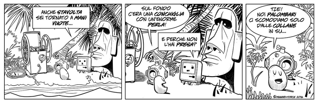 Quasi in contemporanea, a partire dal 2016, assieme all’amico e autore Gian Luca Munari, inizia anche a disegnare Moe Mec & Stone, una striscia a fumetti, pubblicata giornalmente fino al 2019, con protagonisti un sasso, un moai e un vecchio computer.