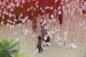 Negli ultimi mesi del 2021, a Londra, nella Temperate House dei Kew Gardens, ha avuto luogo il Japan Festival. Il pubblico si è immerso nel lontano Oriente entrando in una delle più grandi serre vittoriane rimaste, che tra l’altro ospita più di diecimila piante provenienti da tutti i continenti. Oltre agli speciali allestimenti che richiamavano il Giappone, fondamentale è stato l’intervento di Chiharu Shiota.