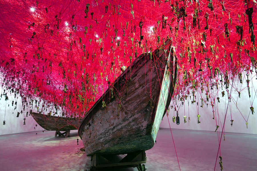 ‘Ti lascio le chiavi di…’ significa permettere ad altri di entrare in uno spazio personale, separato dal mondo, nascosto. È un atto di fiducia e di condivisione, è il segnale di volersi raccontare al prossimo, di svelarsi. Da questo pensiero nasce ‘The key in the hand’, presentata in occasione della 56a edizione della Biennale di Venezia. Da un groviglio di fili rossi luminosi e intrecciati pendono 50.000 chiavi provenienti da diverse parti del mondo e donate all’artista. Due barche poi sono intrappolate tra i fili: accolgono le chiavi e quindi la storia che ciascuna di esse racchiude, permettendo l’incontro tra le vite personali degli altri.