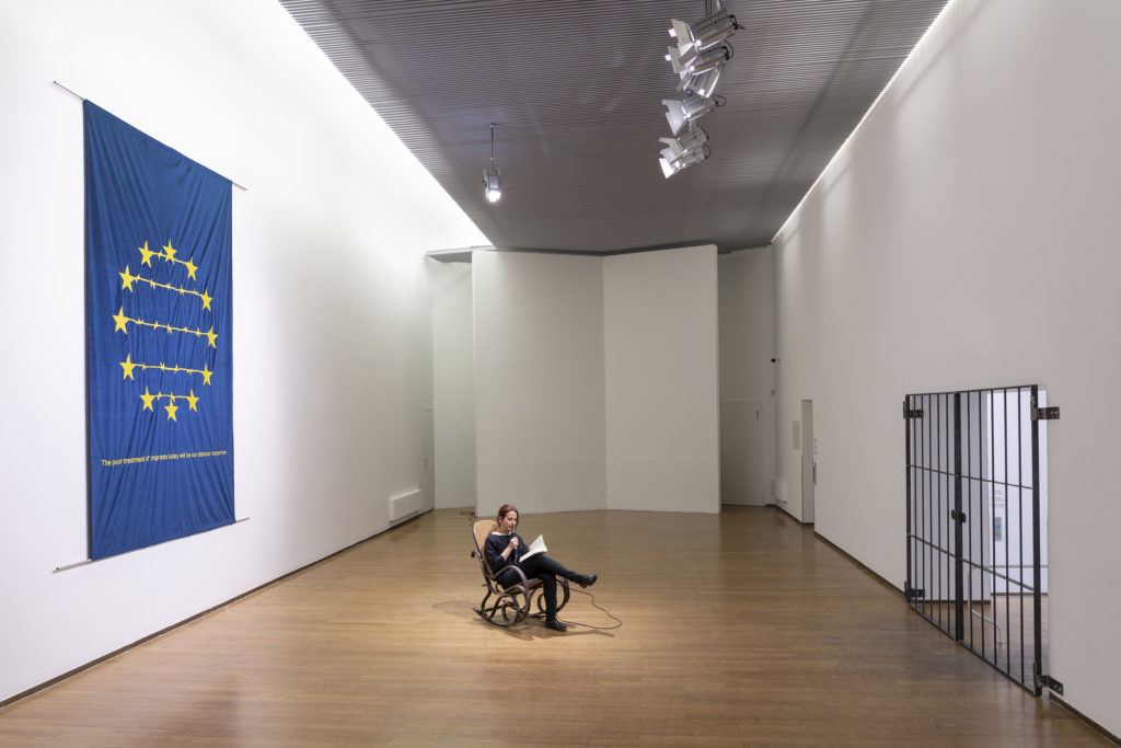 Si tratta, secondo la definizione dell’artista stessa, di ‘Arte fatta dalla politica’ e non tanto in maniera politica. In altre parole, nelle sue opere la denuncia sulle violazioni dei diritti umani, la censura mediatica nel regime castrista e la chiusura dei confini a persone in transito sono tutti soggetti protagonisti delle installazioni. Si tratta di temi forti, emotivamente impattanti, capaci di parlare da sé, senza che l’artista debba costruire una narrativa complessa perché ne sia evidente la denuncia. Un esempio è la bandiera europea che ci accoglie all’ingresso della mostra, quel rettangolo blu a tuttə noi più che famigliare, la nostra culla abitativa, la nostra casa. A connettere le stelle gialle di cui è sovrascritto il blu, ci sono tanti fili spinati. Sotto la bandiera, una sedia e un microfono, perché i visitatorə possano prendere posto e, a voce alta, leggere un pezzo del libro ‘Le origini del totalitarismo’ di Hannah Arendt.