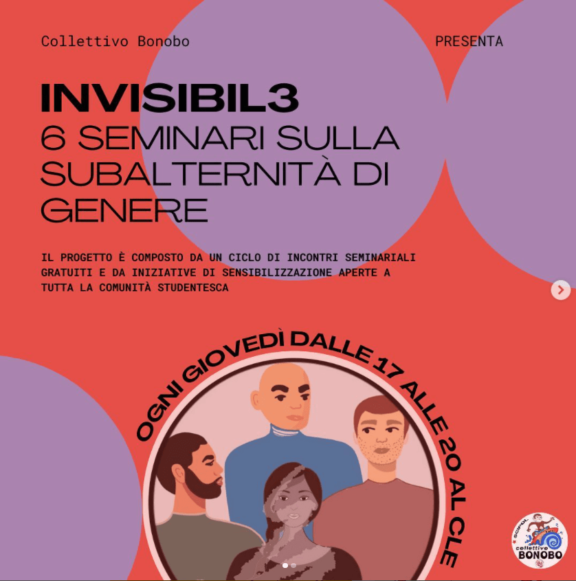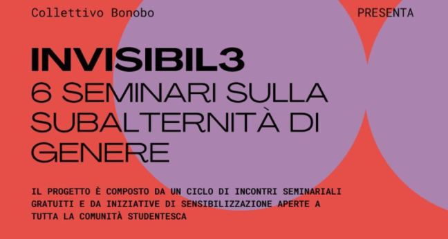 Questo semestre, Collettivo Bonobo ha presentato un’iniziativa straordinariamente degna di nota: Invisibil3, un ciclo di incontri seminariali, totalmente aperti e gratuiti alla comunità studentesca, riguardanti la subalternità di genere nelle tante, troppe, sue forme presenti nella società. Incontri nei quali, attraverso il dialogo con espertə dei diversi campi presi in considerazione, i partecipanti potranno affrontare tematiche essenziali che, pur facendo parte del dibattito pubblico, spesso non vengono trattate con la giusta profondità.