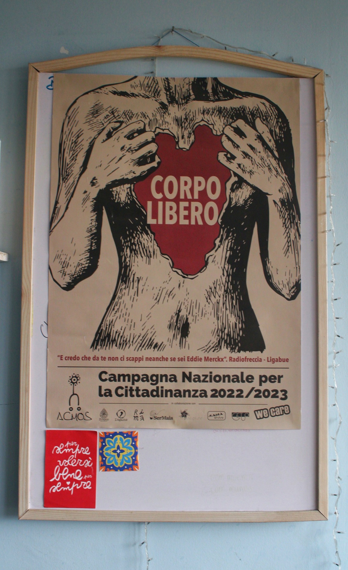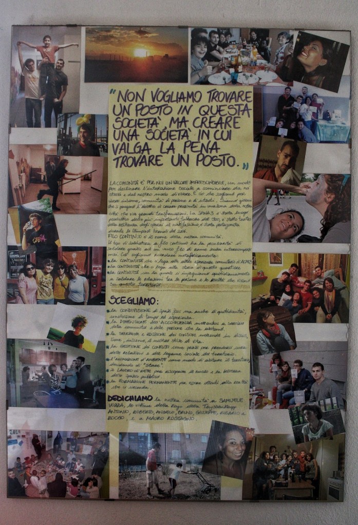 La diversità di questo gruppo non è però tenuta assieme solamente dal voler condividere un’abitazione per abbattere i costi, scelta politica nei confronti di un mercato immobiliare che non facilita l’uscita da casa per i giovani, ma -come recita il manifesto appeso nel salotto della coabitazione di Corso Mortara- Comunità è «continuità, condivisione, accoglienza, lavoro di rete, gestione dei conflitti, selezione e riduzione dei consumi, animazione dell’ambiente e formazione permanente».