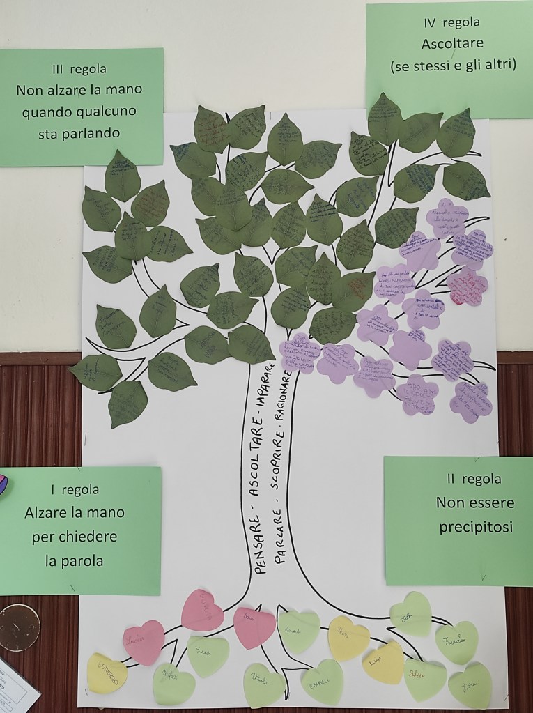 Il piano della discussione è sempre intervallato da attività di gruppo inerenti alla tematica proposta, sia per necessità, in quanto la capacità di tenuta di ascolto e di dialogo in cerchio si sviluppa con l’età del bambino, sia per stimolare l’abilità di lavorare in team e incentivare la competenza del problem solving.