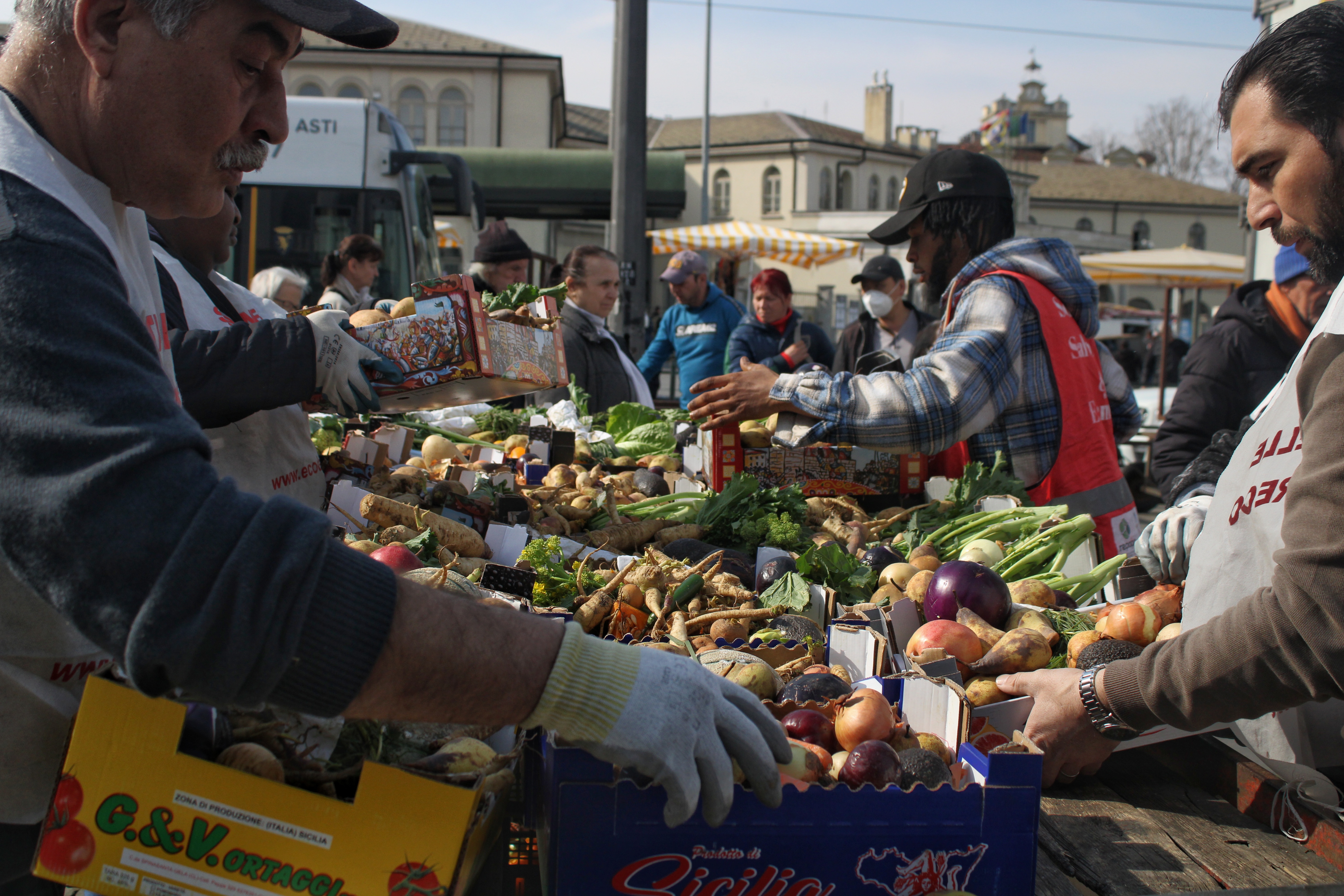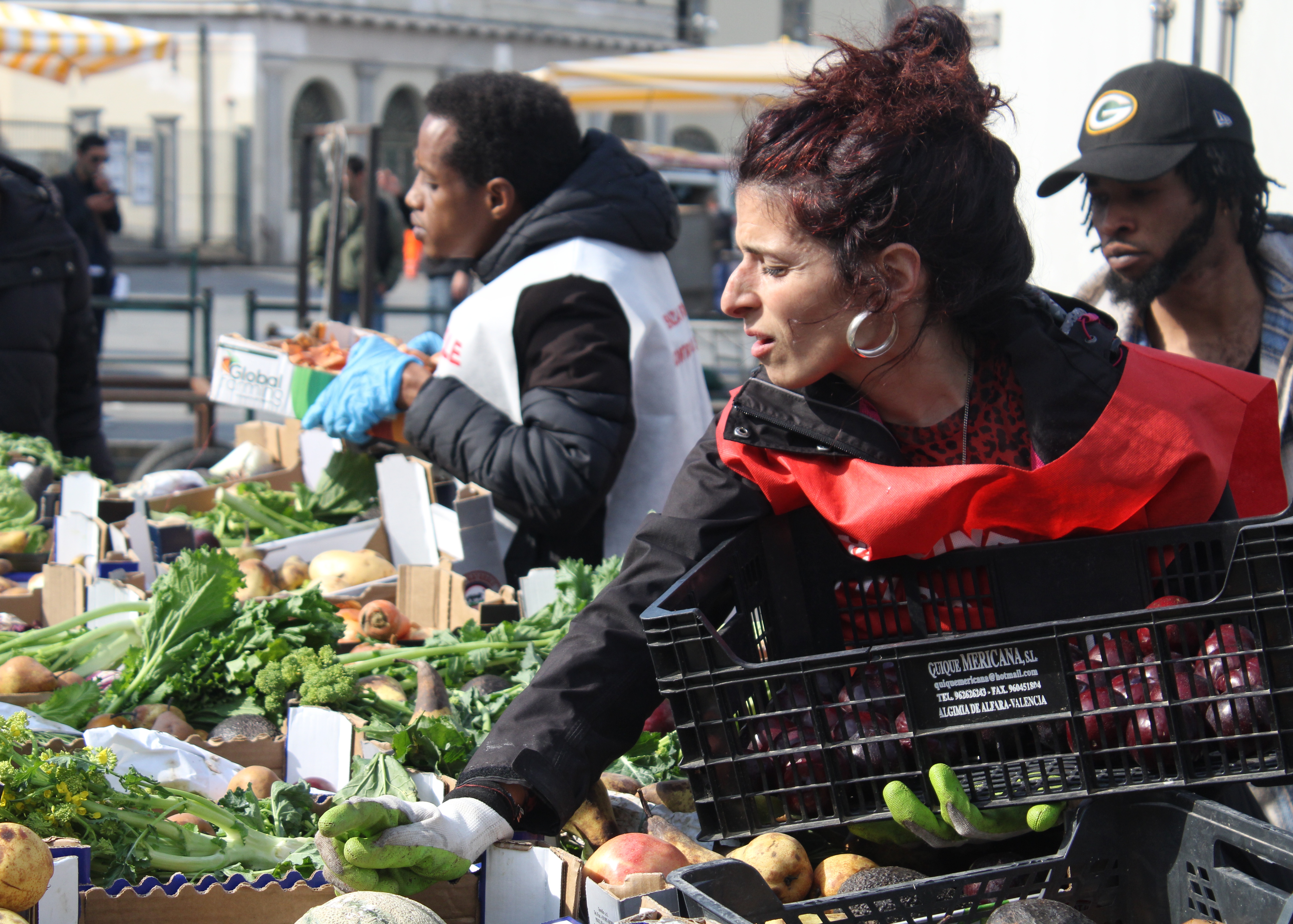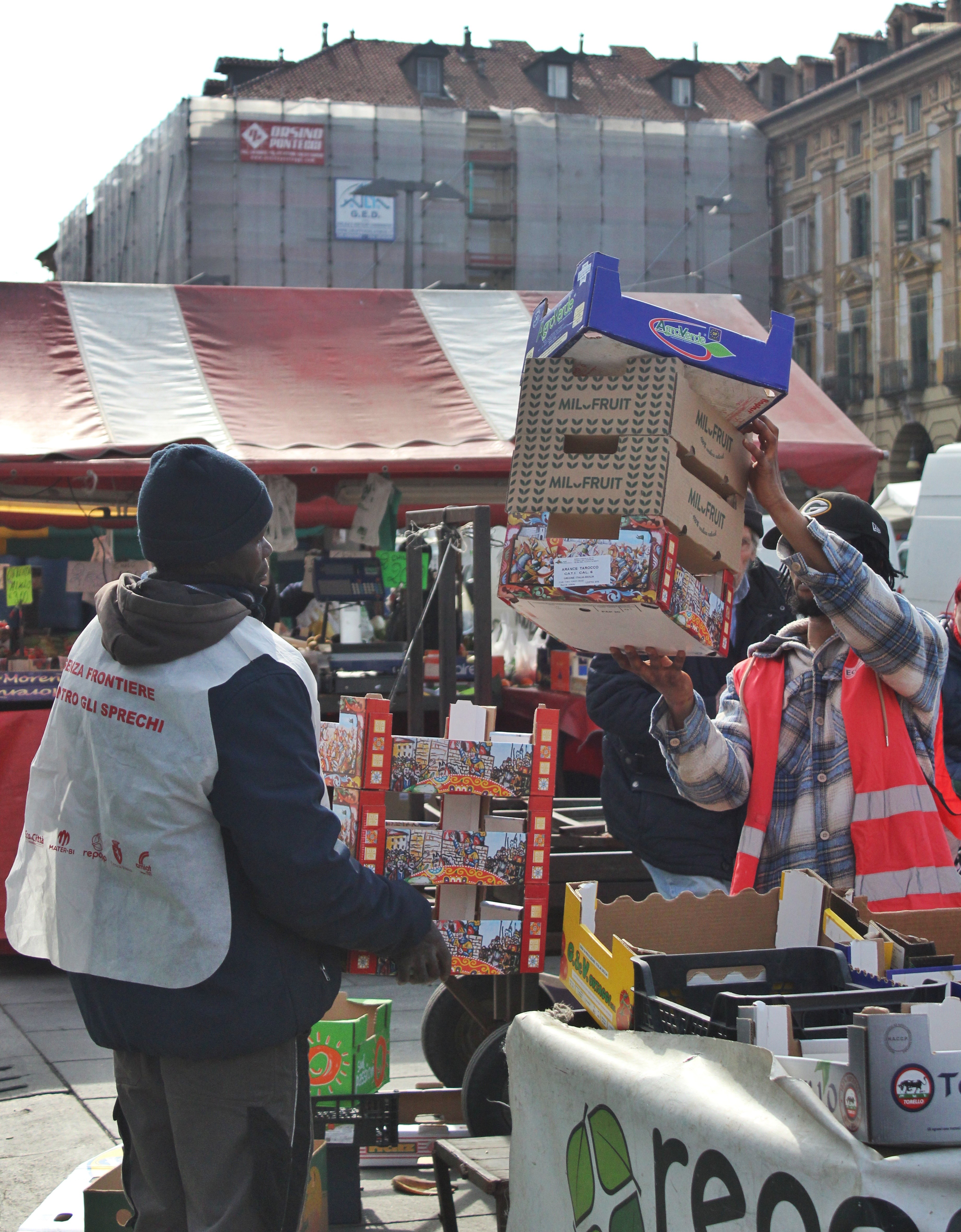 Sono le 13.30 e il gruppo di Sentinelle inizia a sistemare il banco da cui avverrà la distribuzione e a cercare tra le vie del mercato delle cassette adatte – tendenzialmente medio piccole e di cartone – che gli ambulanti non utilizzano più.