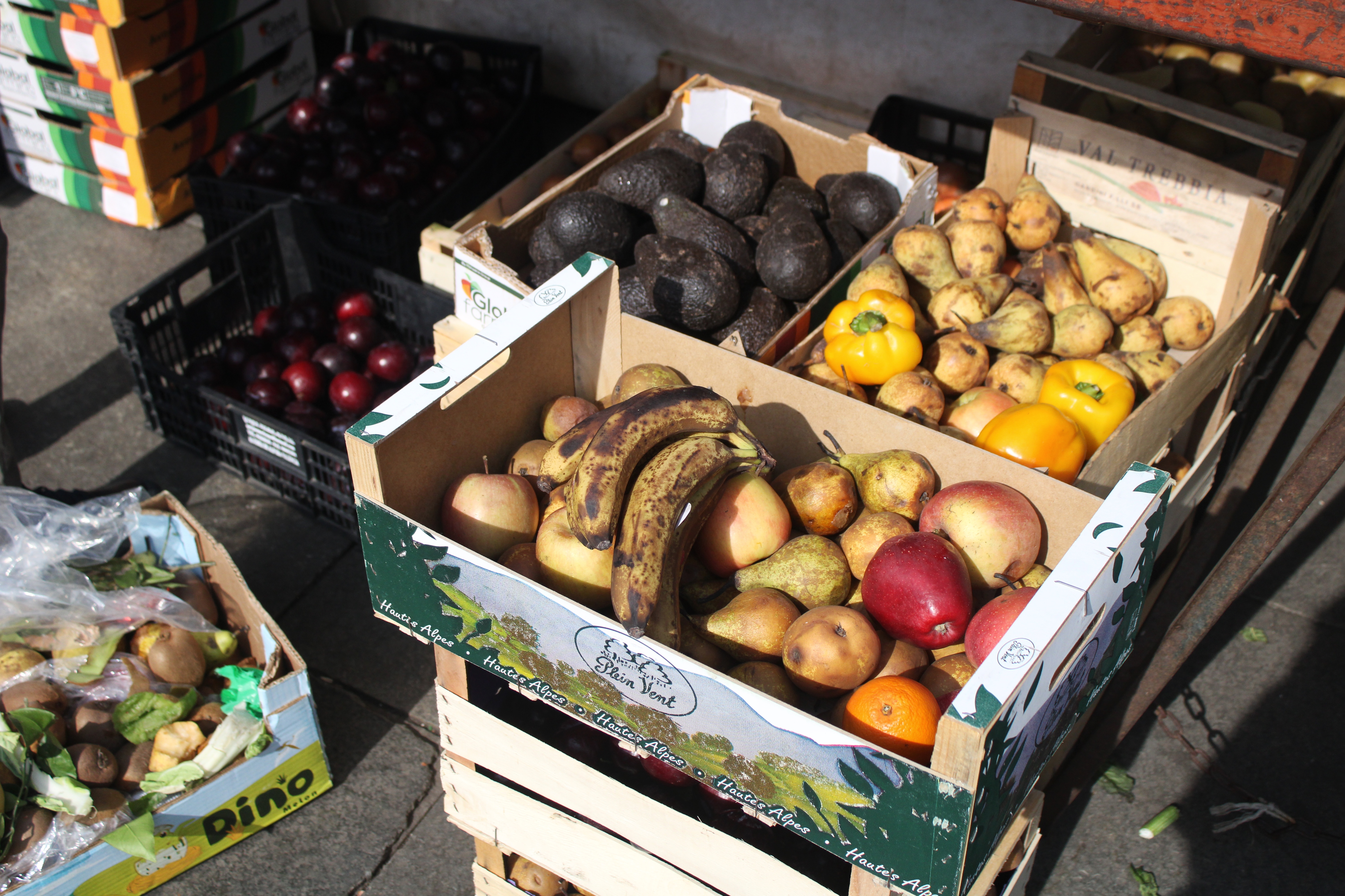 Si passa subito dopo alla ricerca dell’invenduto. La quantità di cibo che viene salvata ogni giorno è enorme: se in inverno sono circa 150 chili, in estate si raggiungono facilmente i 300, con picchi di anche 500/600 chili. Frutta e verdura sono i principali alimenti che compongono le cassette – sempre coloratissime e zeppe – ma non mancano ogni tanto pane e altri tipi di alimenti inscatolati. Rimango stupita dalle enormi casse di pere, avocado, agretti ancora perfetti che però verrebbero gettati via. Si tratta per lo più di frutta e verdura mature, ammaccate o semplicemente non perfette e quindi non appetibili alla clientela.