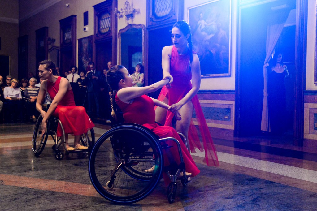 La carrozzina non è solo un ostacolo o simbolo della disabilità, ma è uno strumento per creare delle coreografie uniche, delle dinamiche particolari di movimento che altrimenti non si potrebbero creare. Facciamo spesso questo parallelismo tra danza in carrozzina e pattinaggio artistico perché i movimenti sono molto fluidi, ma in piedi sarebbero difficili da replicare e anche per questo quando ci mancano delle ballerine in carrozzina, delle nostre compagne in piedi si mettono in carrozzina perchè è come indossare dei pattini.