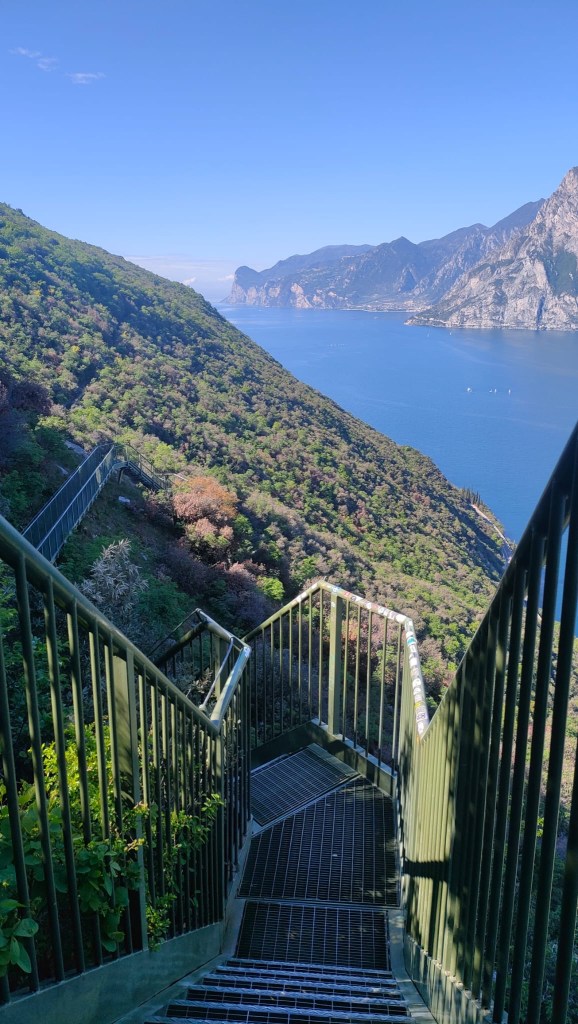 Collego due parti di un sentiero panoramico da cui si può ammirare il lago di Garda. Sono fatta in ferro verde, ho duecentotrentotto gradini a griglia in cui passano vento e pioggia e sono abbastanza lunga da avere diverse piazzole di sosta dove persone e animali riposano le zampe. La mia vera particolarità, però, è che sono puntellata a una parete rocciosa con spesse travi e sono sospesa nel vuoto. La mia, effettivamente, è una zona tra le più impensabili per una scala. Non mi trovo in un palazzo, né all’ingresso di un negozio e nemmeno in una piazza famosa. Rimanga tra noi: pure tra le mie amiche scale c’è chi gode di certi privilegi – pulizie costanti, foto, articoli di giornale e via dicendo – e chi invece non ne ha e si accontenta di finire su qualche rivista di settore, ma la maggior parte sono del tutto dimenticate.