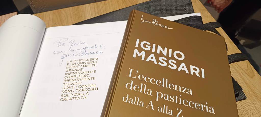 Il tutto culminato nella me ormai rigonfia di zuccheri ed esaltata come un cavallo che, incrociato l’angolo delle case editrici, tra uno sfogliare e uno scattare foto impudiche a ricette che probabilmente mai mi darò il tempo di fare, si porta a casa l’ultimo libro di Iginio Massari, IL Maestro dell’arte della pasticceria. Un frizzante tomo da 8 kg di peso per non so nemmeno quante pagine di narrativa sui tecnicismi della materia. Com’è finita? Io che, da lì a poco, intravedo il Maestro e, fiondatami al suo cospetto, gli strappo un autografo e due chiacchiere, a un libro di cui probabilmente adesso mi toccherà testare qualche ricetta.